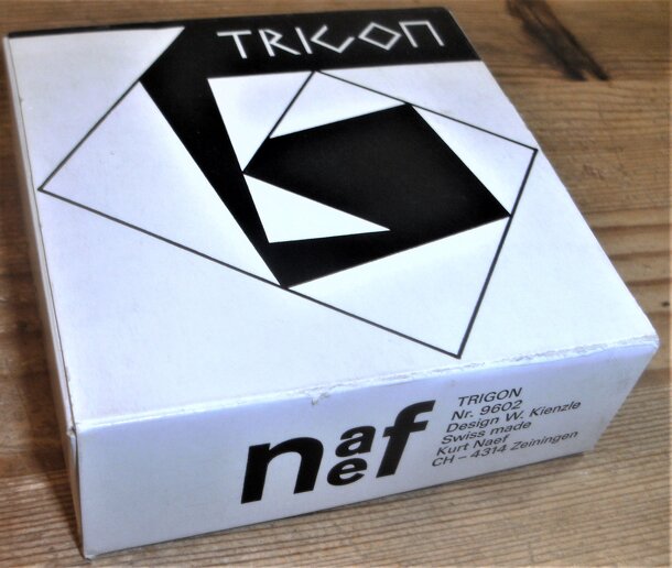 Trigon is a tile placement game by Wilhelm Kienzle from 1951 and was published by Naef in 1958. Each player gets a set of 9 similar right triangles (5 different sizes) that form a geometric sequence. All 9 tiles together form a square with a square hole in which a cube (the die) lies. A triangle is made up of two smaller ones in the sequence. The side...