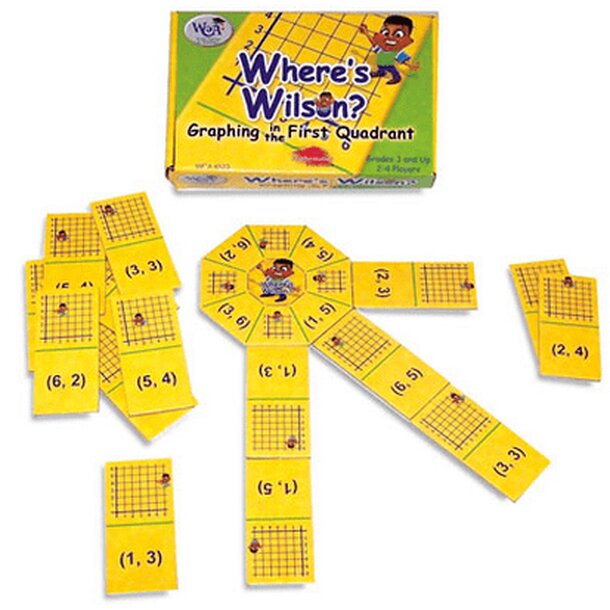 Where's Wilson? provides playful practice in identifying and plotting ordered pairs, an essential skill in algebra! The first quadrants of the coordinate plane enhance the understanding of integers. The distinctive starting board offers eight tracks for placing dominoes. Players match each ordered pair with one of the 16 locations where Wilson is hiding....