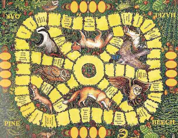 The board is laid out with a tree in each corner and a clearing in the centre. Players move along pathways that connect the different areas, and they follow printed directions, which include both forfeits and rewards. In the middle of each outer edge is a store comprising four oval spaces on which players place the food they have gathered. The playing...