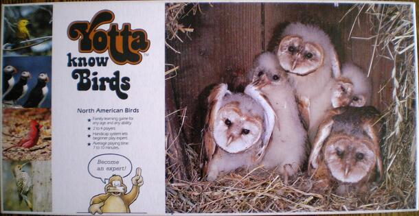 Part of a series of "Yotta Know..." games on different topics, Yotta Know Birds is a game played on a six-by-six grid board on which players place cards depicting birds to be identified. The first player to identify seven birds wins the round. Rolling dice adds a randomizing element to gameplay, while a handicap system allows players of varying knowledge...