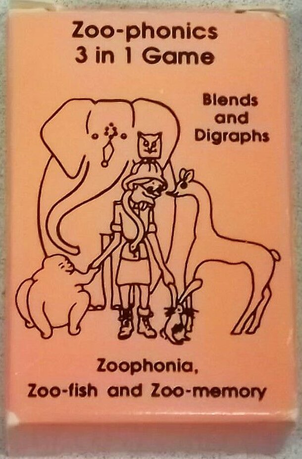 This early product of Zoo-phonics uses different decks with sets of pairs of cards. One deck has 26 pairs for each letter of the alphabet, along with the name of the animal assigned to that letter, e.g. Allie Alligator, Honey Horse, Vincent Vampire Bat. Another deck has 40 pairs of 2- or 3-letter blends and digraphs. The three games are adaptations of...