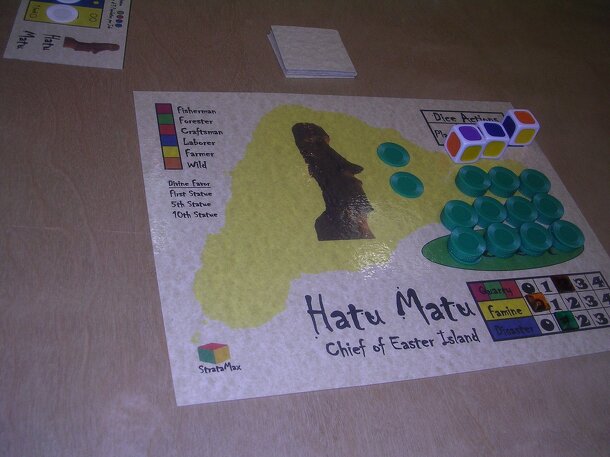 Players are vying for recognition and to be named Hatu Matu: Chief of Easter Island. Players must recruit islanders to act as Fisherman, Laborers, Farmers, Craftsman, or Foresters. They use the resources produced or harvested from the island to gain status by erecting statues on Easter Island. Alas, just as with the real Easter Island, players slowly...