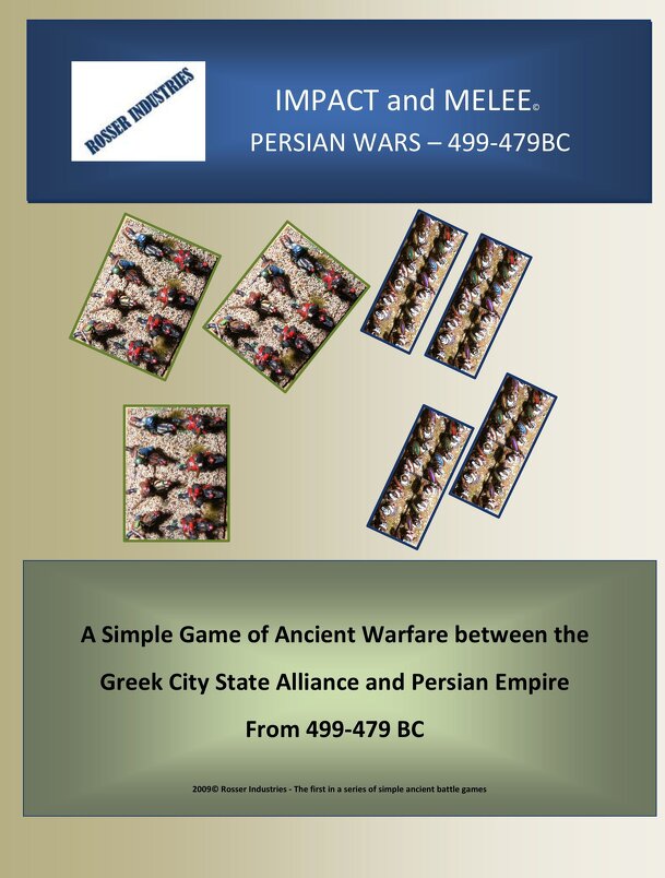 "A Simple Game of Ancient Warfare between the Greek City State Alliance and Persian Empire From 499-479 BC." From the rulebook: IMPACT and MELEE: Persian Wars - 499-479 BC A simple and quick war game of a GREEK vs. PERSIAN battle Game pieces are represented by top down full color photos of Greek and Persian warriors of the time of PERSIAN WARS (@ 499-479...