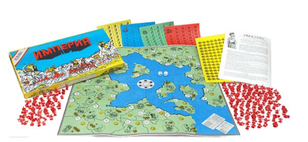Империя ("Empire") is a conquest and building game, much like Risk and Civilization, with only two pages of rules. The map is divided into territories. Each territory has the portrait of its dictator on it along with a gold symbol for how much income it gives, and symbols for the units it can recruit. —user summary The turn begins with a roll of the dice...