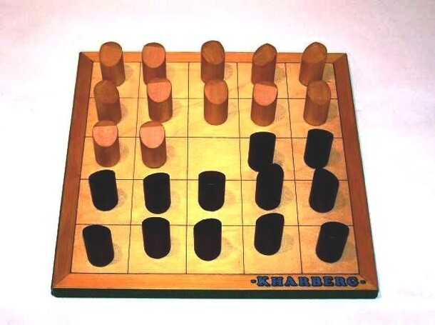 Kharberg is a simplified form of the moorish game Damma, but with a difference. The gamepieces may be moved in any given direction, so the player has the choice of eight directions for each pawn. This gives Kharberg game an edge (far more mobility) over the games where the pieces only may be moved forward. To play KHARBERG the players need: 12 white pawns...