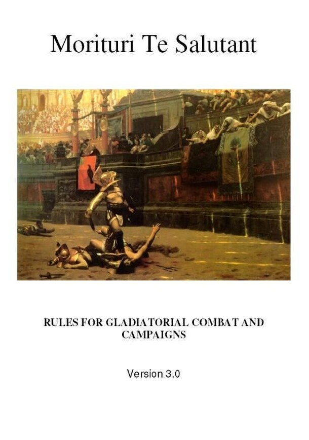 Morituri Te Salutant is a miniatures rule set for gladiatorial combat. It was initially published by Gladiator Miniatures but the current (3rd) edition came out from Black Hat Miniatures in 2008. According to the preface for the latest edition there are no significant differences between the 2nd and the 3rd edition of the game. MTS consists of rulebook...