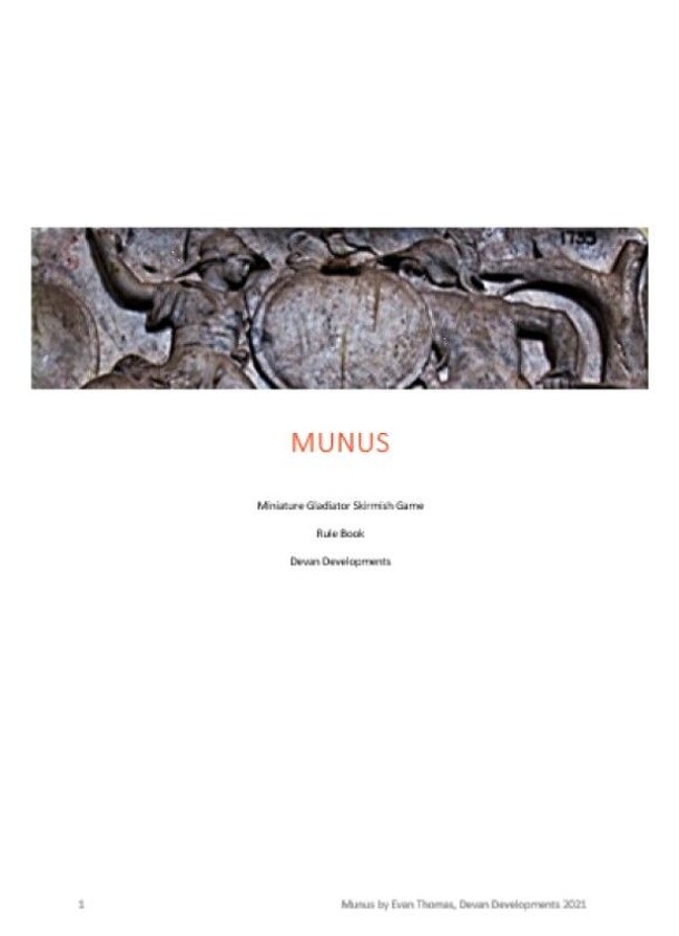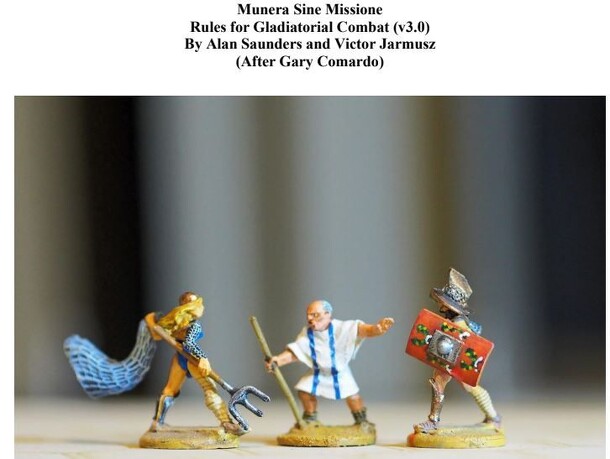 Munera Sine Missione is a free set of miniatures rules which are designed to allow players to recreate gladiatorial combat in the arenas of Ancient Rome. The are designed to give a very quick, simple game, which can be played in ten or so minutes The game uses a hex grid to regulate movement, and each gladiator has a number of action points to spend each...