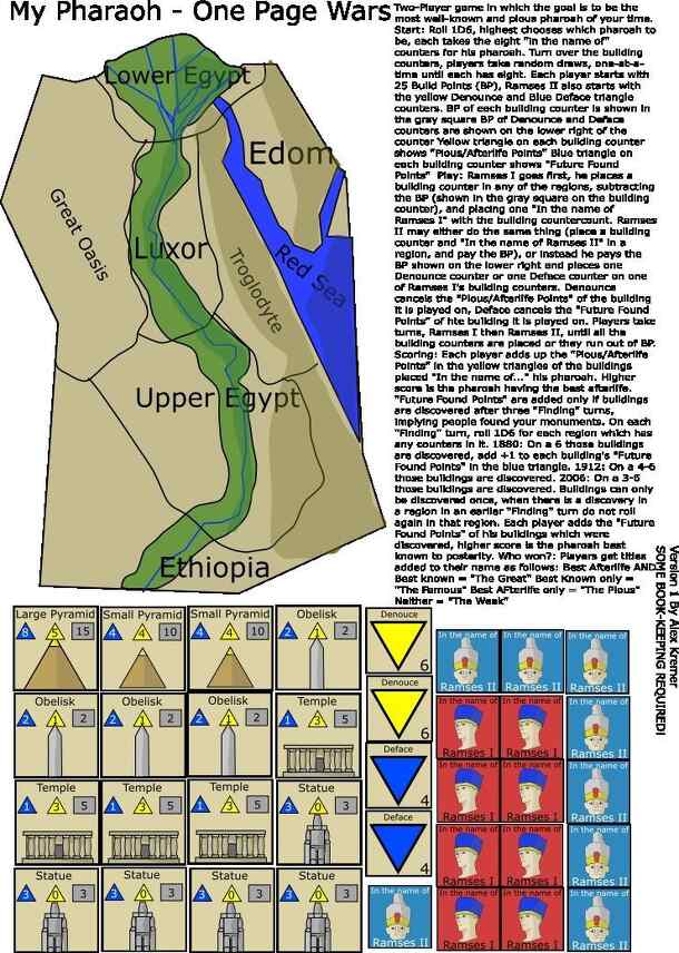 From the One Page Wars game series. The players compete, as Ramses I and Ramses II, to become the most well known and pious pharaoh of the ages. Using a limited supply of "build points", the players build pyramids, obelisks, statues and temples in and around Egypt. The Ramses II player also has the opportunity to denounce or deface the monuments of his...