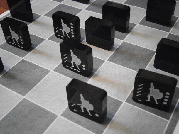 The base game contains 12 myrmidon pieces (two each of six different types) (as well as a 6×7 checkered board and a cotton case). This expansion contains 28 additional pieces (two each of 14 new different types) in order to provide quite a few additional playing configurations. The base game allowed 720 starting combinations for each army, amounting to...