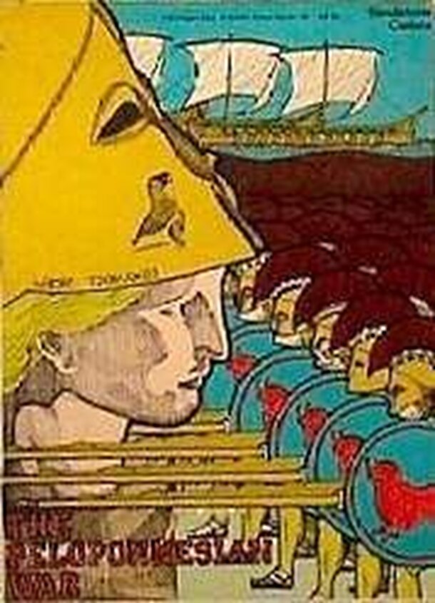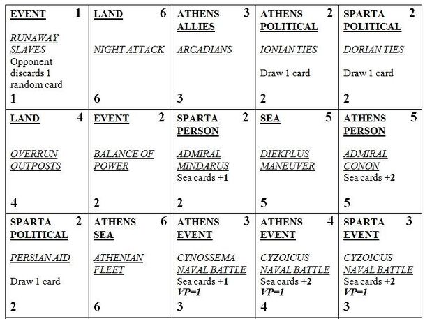 Card game for 2 players simulating the Peloponnesian War. One player is Sparta, the other is Athens. Players take turns playing cards. Cards score Victory points, add to your force total, or have special effects. The player with the highest force at the end of a round wins the victory points. The cards include the personalities, land forces, naval forces...
