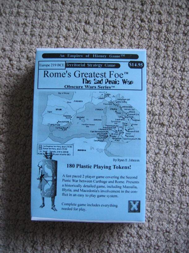 Rome's Greatest Foe: The 2nd Punic War is a fast paced 2 player territorial strategy board game. Carthage and the famed Hannibal squares off against the Roman Republic and its allies. Presenting Rome's allies of Messalia and Illyria and the Macedonian invasion of Illyria. Can the wealthy trade city of Carthage and Hannibal's invasion force cripple Rome...