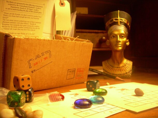 Egypt 2100 BC: In the temple of Thot, god of science and inventor of the game, the priests met annually to choose the highest priest of the temple. They did so by playing the game. Therefore they gathered around a board studded with Scarabs. The goal of the game was to collect as many pieces as possible. Because the one who had the most valuable collection...