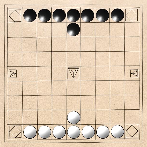 Three Dragons is similar to ancient custodial capture board games such as Petteia, Tablut, Hnefatafl. However, it has two additional features as advanced variants of the base game: Player pieces have strengths, so that a stronger piece can capture a weaker piece (in additional to traditional custodial capture), and Three "dragon cave" spaces on the board...