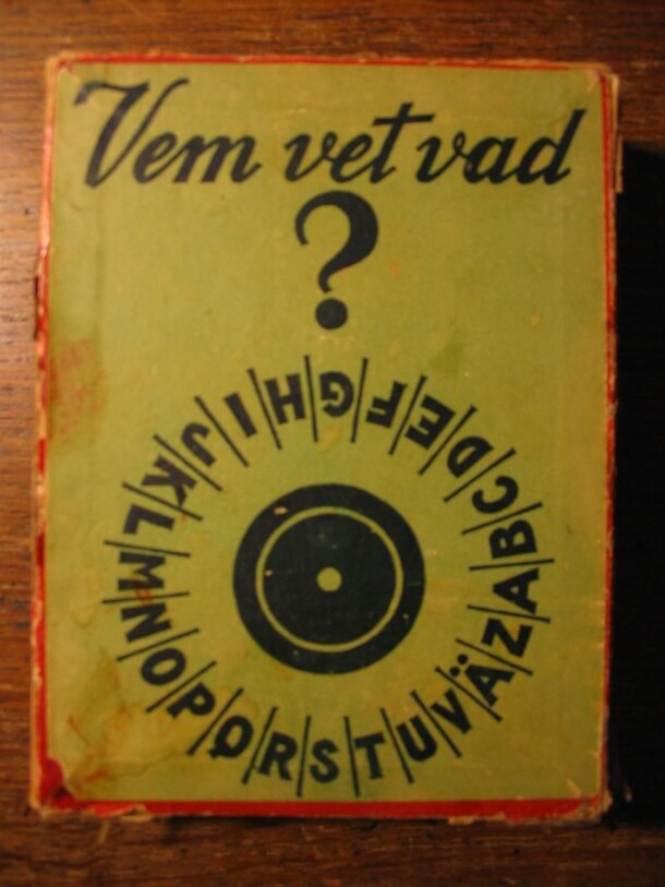 Vem vet vad is a Swedish word game. Each turn, a card is turned up to reveal a category (a capital, a farm animal, etc). Then a wooden roulette-like spinner is rotated to select a letter. Whoever first comes up with a word starting with the selected letter that fits the category gets the card. The person who collects the most cards wins. My copy contains...