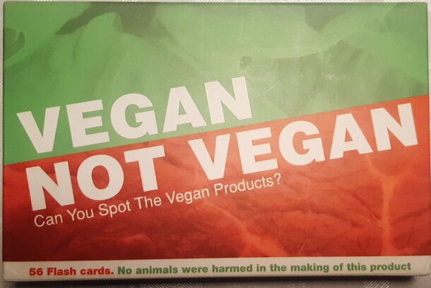 The premise of Vegan Not Vegan is simple. The deck contains of 56 cards. One side of the card shows a food product or a drink. The other side tells you if, yes or no, the product is vegan-friendly. Choose how many cards you want to play with. Show a card, and the group of players have to decide whether or not they think the pictured product are...
