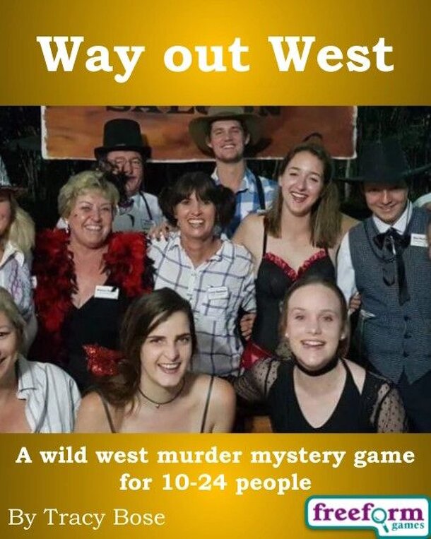 From the Publisher's web site: Way out West is a dinner party murder mystery game for 10 to 14 guests and a host. Join us in a thrilling evening of scheming, intrigue and skulduggery. You will be in the middle of the action and it will be up to you to wheel and deal with the other guests. Can you achieve your goals, keep your secrets hidden and survive Way...