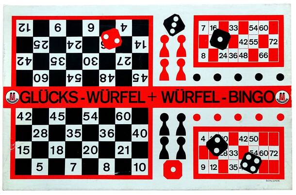 Glücks-Würfel (2 players) The game is played on the black and white game board. Each player (black and red) has 4 meeples. The players roll two black dices and a red die. The eyes of the black dice are added and multiplied with the eyes of the red die. If the result is a number printed on the bottom row of the game board, the player places a meeple on this...