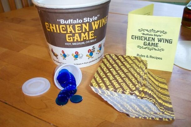 Earn points by completing orders of chicken wings, made up of number cards representing the number of wings in the order, a mild, medium or hot sauce card, and a blue cheese chip. Orders are single (10 wings), double (20) or bucket (50). Larger orders and hotter orders are worth more points. You collect cards by answering chicken-related trivia questions....