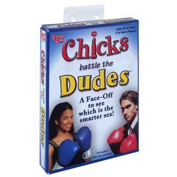 A Face-Off to see which is the smarter sex! Which has more "pull" - the women or the men? Chicks Battle the Dudes™ is an entertaining and fun party game that invites men and women to show off their smarts on sports, fashion, cooking and careers. Women are asked questions that most men can answer, and the men are asked questions that most women can answer....