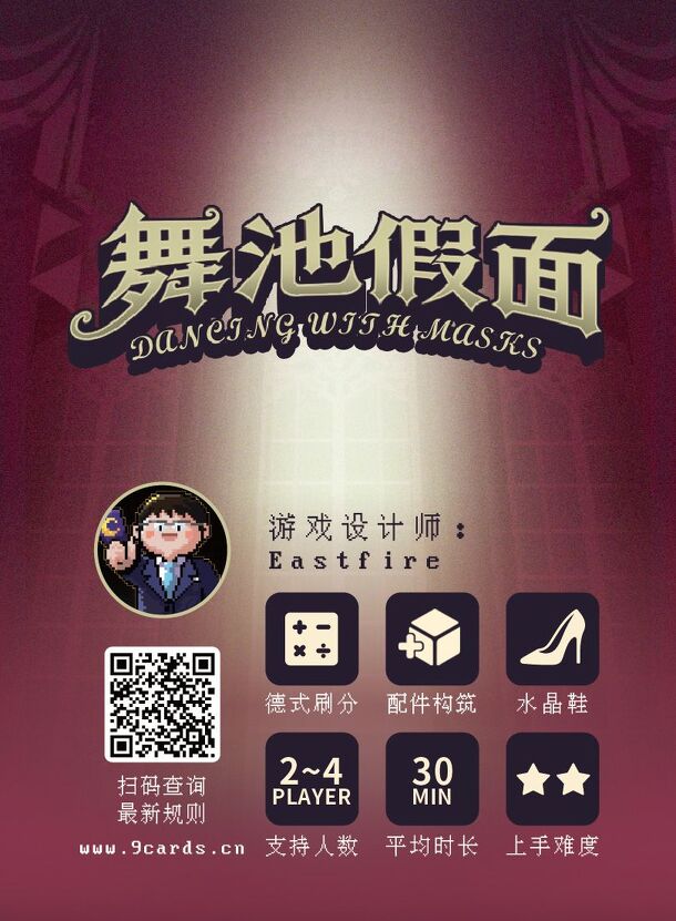 Dancing with Masks (舞池假面) is a competitive Euro-style point-scoring board game for 2–4 players, centered around a component-building mechanism. In the game, players don masks and step into a grand fairy-tale ballroom—where until the very last moment, no one knows your true identity. —description from the publisher This game is part of the third edition of...