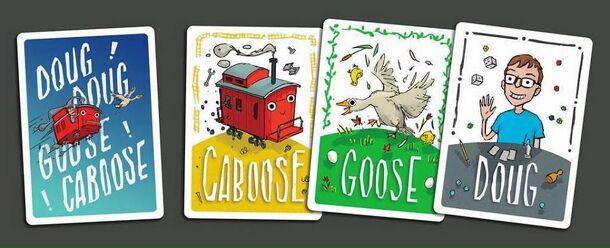Doug, Doug, Goose, Caboose is a quick party game inspired by the children's playground game "Duck, Duck, Goose". The game supports 3-8 players, and plays in about 10 minutes. The dealer shuffles the deck of cards (one per player in the game), and deals one, in turn, to each player, calling out the card each time. Once both the "Goose" and "Caboose" cards...