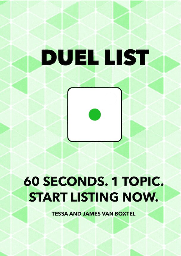 Duel List is a competitive knowledge listing game in which players simultaneously list as many items in a topic as they can in 60 seconds on a piece of paper. Gameplay: On a turn, the active player picks one of the 9 knowledge decks and rolls 2 dice. 1st die chooses category, 2nd die chooses specific topic. Players have 60 seconds to list as many items as...