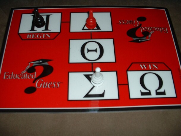 Educated Guess - Drawing game. Divide everybody up into two teams (there are rules for 3 players). Players alternate as the DRAWER and try to get their team to guess what they are drawing. Both teams may guess every round. If the DRAWER's team guesses correctly then they move ahead one space. If the opposing team guesses then the DRAWER's team is blocked....