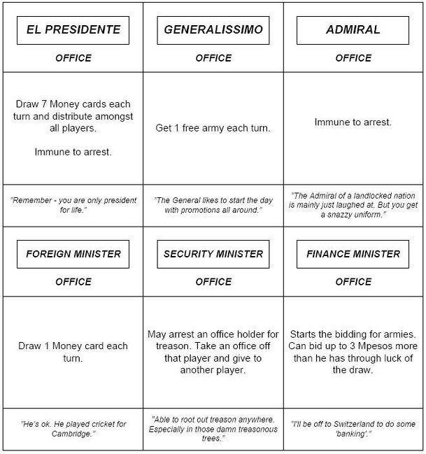 El Presidente is a game of forming a Military Junta to run a fictional country. Players use their military power to vote for their preferred El Presidente who then allocates all the other offices in the Junta to the other players. El Presidente then allocates the yearly budget to all the players which they use to purchase armies by auction. However if El...