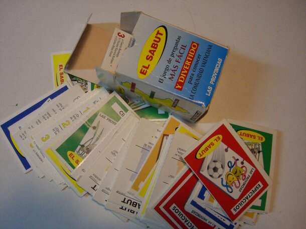 This game gave away with the newspaper "Las Provincias" of Valencia. It's a game without dice or pawn, or board, only questions. On each card there are three questions, answer more questions he gets the card and whoever has more cards wins. The questions are on the Valencia region in Spain. There are five types of cards, according to the subject: -Events...
