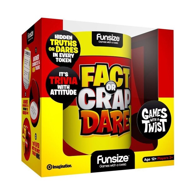 Basic trivia game where players try to figure out if a statement is a Fact, or just a load of Crap. The players take turns being the Reader in a clockwise direction. After the Reader has read the first question, the other players have to decide as fast as they can whether the answer is Fact or Crap. The players indicate their answer by putting face down...