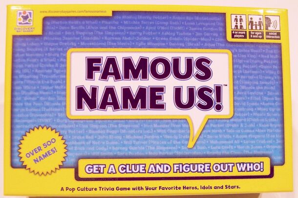 From the back of the box: Did you know that Barry B. Benson (Bee Movie) broke the "never talk to a human" rule? Or that Bow Wow was born Shad Gregory Moss? Actors, musicians, move and animation characters! Play the game and guess who they are! Famous Name Us! gives you 4 clues that start out vague and get specific. If your team members guess the famous...