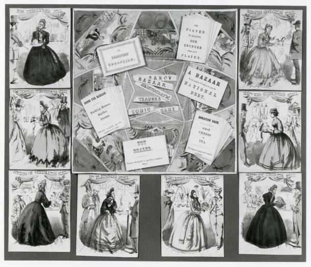 Mainly a card game, with the gameboard being a place to put the counters. The aim of the Bazaar is fourfold: to aid the Acclimatisation of Society, to help pay the National Debt, to raise a fund to build a bridge from Dover to Calais, and to build a school to teach Grown Children. The stalls are run as follows: the Fruiterer and Greengrocer is Lady...