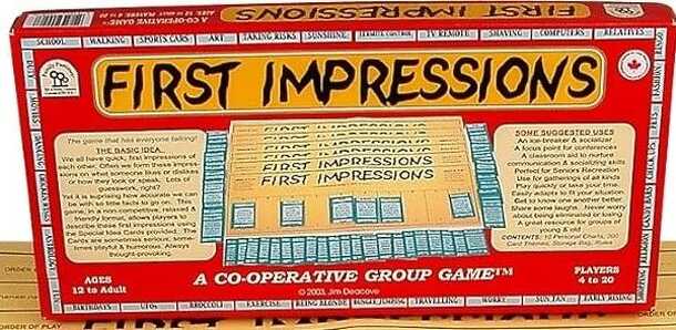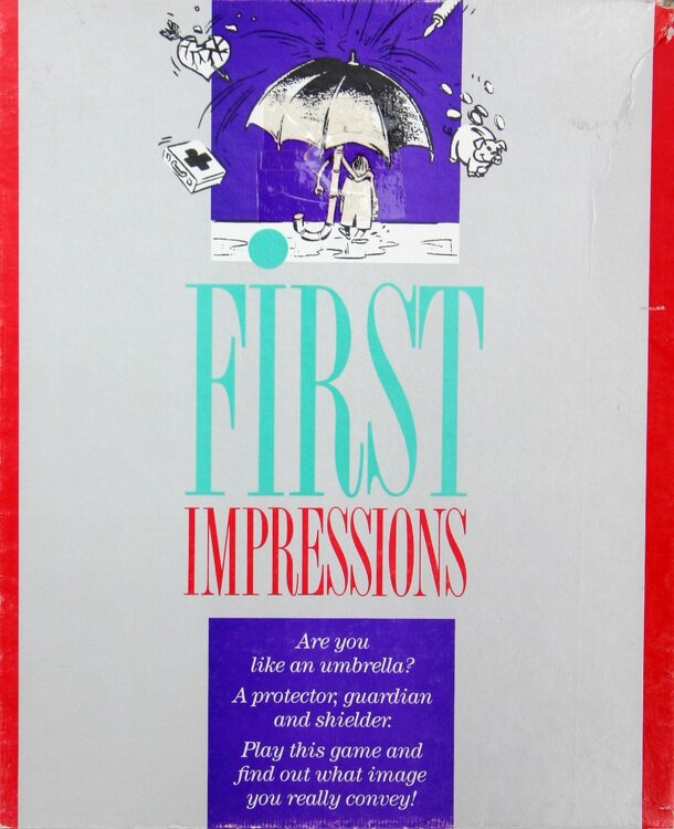 From the box: FIRST IMPRESSIONS is about the very people who play it. Have you had dinner with Attila the Hun, been married to a magnifying glass or just good friends with a cactus? 440 witty, perceptive, striking cartoons form the basis of this fast moving game where your imagination, eloquence and judgment can run wild. The cards are played in turn and...