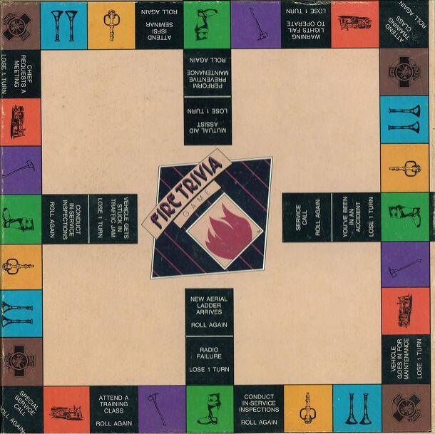 Similar to Trivial Pursuit but with a questions regarding fire. The object of the game is to successfully obtain a full set of six pawns (one from each category) to "man" your fire engine, then proceed to the center of the board and answera question to "put out the fire". The categories are: Fire Apparatus Tactics Safety Industrial Fire Protection General...