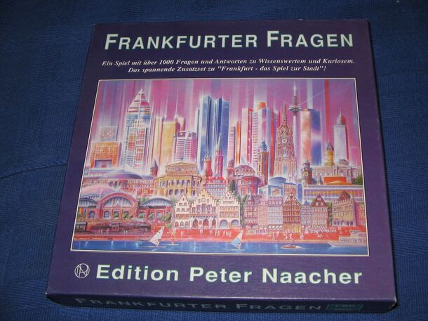 Frankfurter Fragen is a stand-alone extension to "Frankfurt - das Spiel zur Stadt" It consists of 300 question cards with about 700 questions about Frankfurt trivia. They are printed on both sides, the front being blue with symbols consisting of a short question/answer and the back being red with a more detailed reply. The front also has special questions...