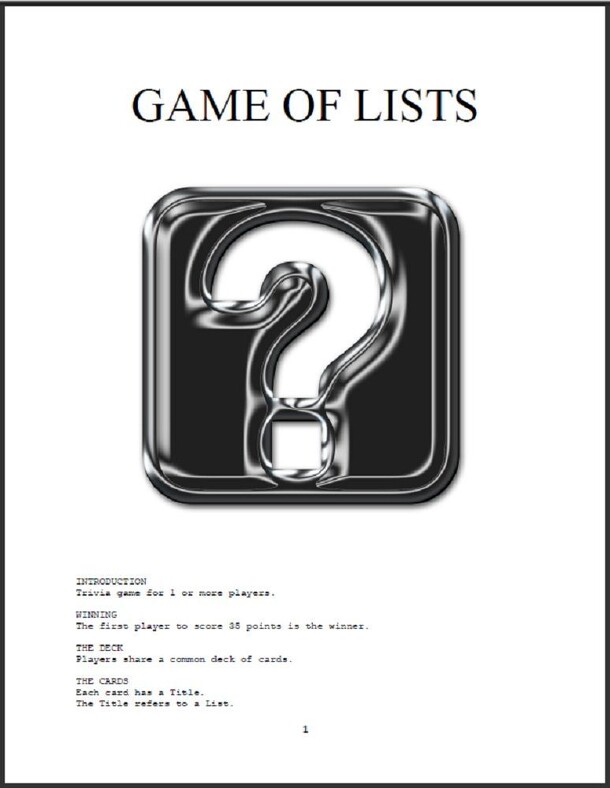 “Trivia game for 1 or more players. Winning: The first player to score 35 points is the winner.” The game consists of a custom deck of cards. Each card describes a category. A card is drawn and the players are given a set amount of time to write a list of items that come within the category. Once the time limit has expired, the players reveal their lists....