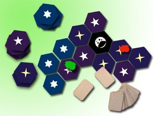 At the beginning of the game only the "Moon" tile is on the "night sky" board, and players will progressively add "Stars" tiles to the board. There are 3 different kind of Stars (4, 5 or 6 branches). Each player has his own secret goal telling the shape of the Constellation he must realize on the board. To be valid, a Constellation must be made of only 1...