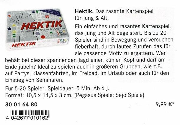 Hektik is a Pit clone for many players. There are 20 sets of 7 cards in the game. One set is used for every player involved. Each player is dealt seven cards. All players pick up their hand simultaneously and start trading over the table. A player can offer any number of the same symbol, but can only name the number, not the symbol. S/he then tries to find...