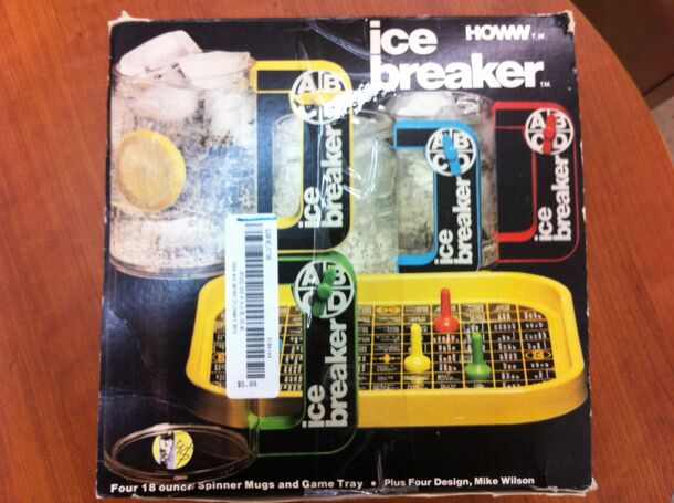 Ice Breaker is a party game designed to allow people to get to know one another by answering simple personal questions (i.e. 'How many times did you have to take your driver's test?' or 'Have you traveled outside the USA?'). The game comes equipped with four mugs, each with a different color handle, a game board, and four matching color pawns. The mug...
