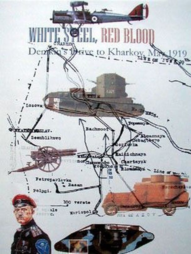 WHITE STEEL, RED BLOOD covers the Drive to Kharkov in May 1919. This was the first major offensive using Denikin's rebuilt elite Volunteer army now armed with British Whippet, Mk V tanks and supported by DH9A bombers and Re8 light bombers. It was an offensive that would expand the White front by nearly 100 miles within 30 days. It was the first time the...