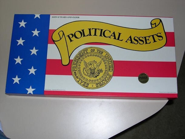 Heavily inspired by Monopoly (Roll/move, land on properties which you can buy, etc.), in Political Assets players attempt to accumulate wealth and public opinion in a bid to become President. From the game summary: "The object of Political Assets is to rise from the ranks of an everyday taxpayer to become President of the United States...to win the game...