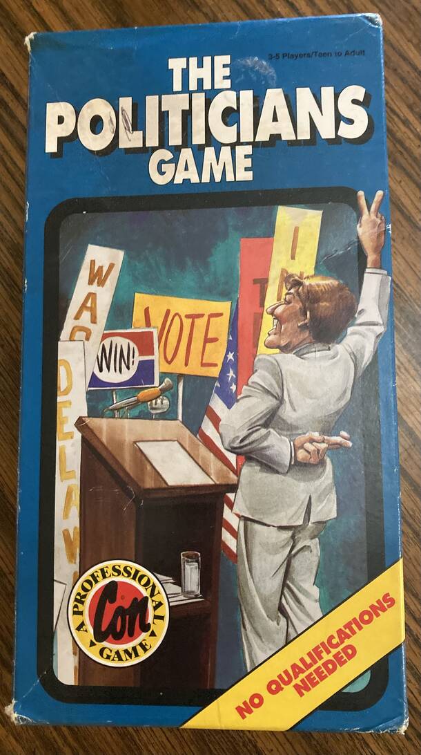 from publishers web site Politics is a board game for 2-6 players Ages 8 and up. Politics is a game that allows you to enjoy the highs and lows of a political career from Mayor to President. Politics is simple to learn. You do not need to know or like politics to play, enjoy and win the game. Unlike real politicians, if you have a bad run in your political...