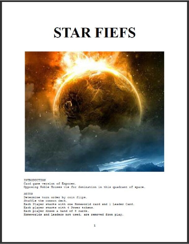 “Card game version of INVALID OBJECT ID=, type=thing. Opposing Noble Houses vie for domination in this quadrant of space.” Each player starts with one Homeworld Card, one Leader Card, four Power Tokens, and a hand of eight cards drawn from the deck. The game is played in the following phases: Intrigue, Event, Duel, Attack (Military or Political)...