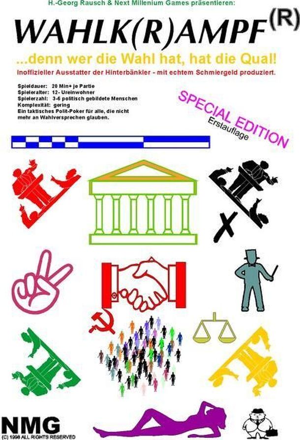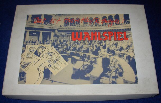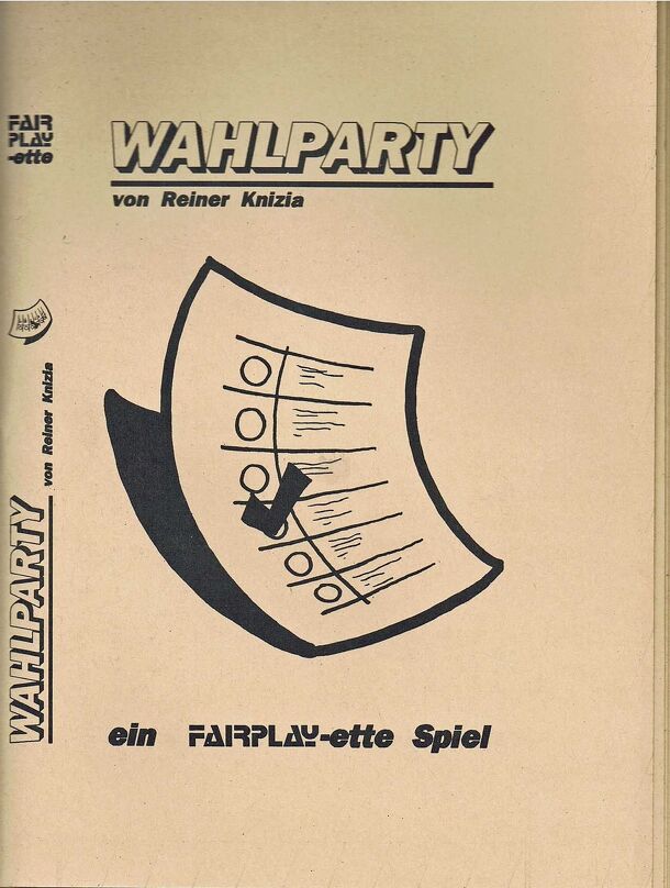 Wahlparty is an election game in the political system of Bundesrepublik Deutschland. Players try to collect sets of cards for 16 federal states to gain the majority. The cards are all dealt out and then players must engage in real-time open trading to assemble majorities. This game was published as a supplement for Fairplay, a German print magazine for...