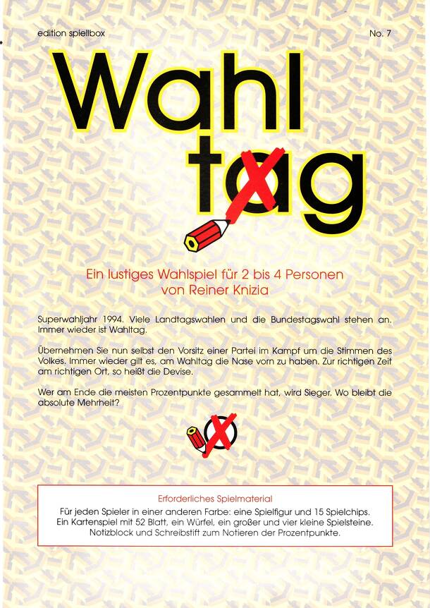 In Wahltag, the players try to win the election for the German parliament (called Bundestag). During their turn, the player chooses between moving their pawn to another area or performing an election campaign by throwing a die and then placing chips. During the game, results are tallied in each land and the player adds their own percentage of votes...