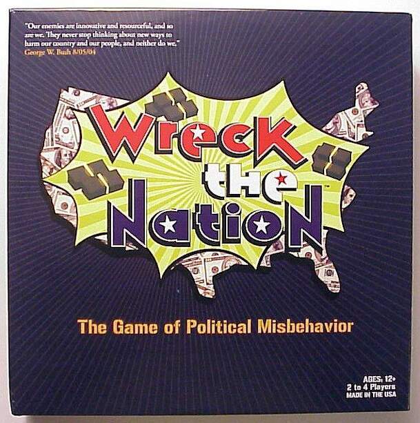 Wreck The Nation: The Game of Political Misbehavior injects political satire into a classic board game format. Players race to spend billions of dollars in play money while following real Bush policies. They become Politicians beholden to special interests, receiving one trillion dollars in taxpayer money. Players throw the dice and travel around the...