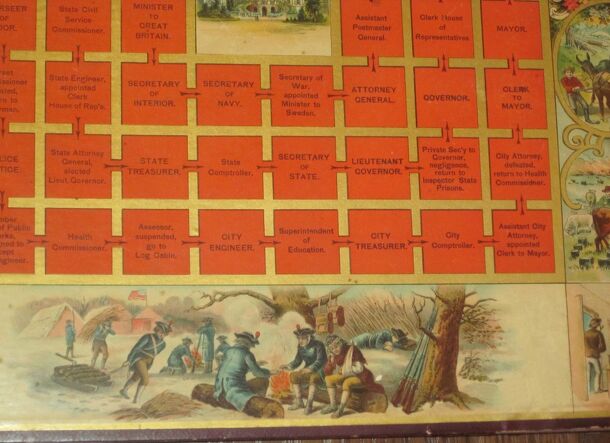 Each player takes one piece, and puts it on the Log Cabin. At the beginning of the game each player must spin a one to advance to the first square. All plays are made in turn, moving the number of squares spun with the dial. Each square represents an office, and a progress to the White House. If a player stops on a square indicating a promotion or a...