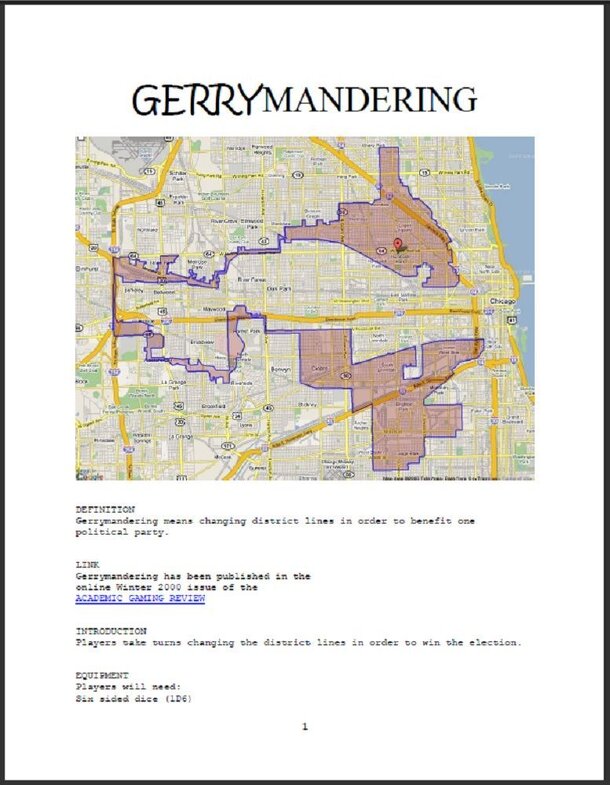 “Players take turns changing the district lines in order to win the election.” The game is played on a 10x10 grid. Each square represents a city block. At the start of the game, 100 Block Chits are randomly placed on the map. These Block Chits are randomly created by rolling for four characteristics: Income, Party, Race, and Issues. Each player supports a...
