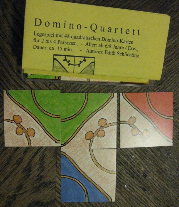 48 square tiles (16 different cards 3 each) are shuffled and every player get 3 in the hand. Starting player put one card on the table and draw one card to have 3 hand-cards. On your turn you lay a matching tile. Each tile has a triangle in one of the four colors and a triangle with a number 0,1,2 or 3 of dots. When you finish on 4-tile square you count...