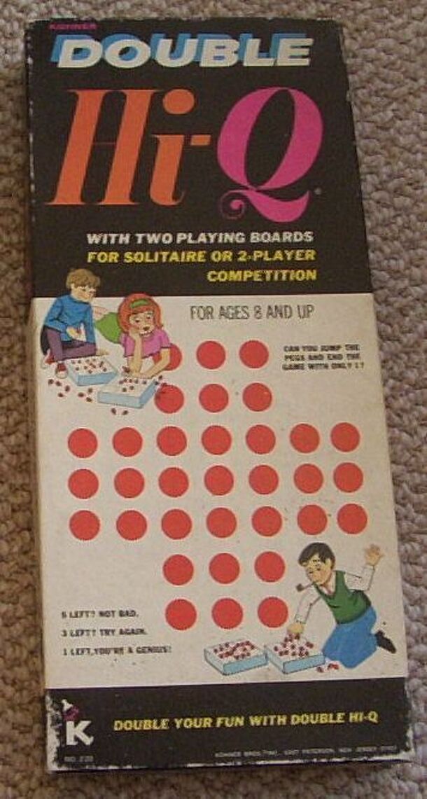 This is a two-player version of the popular Solitaire peg-jumping game in which a player attempts to remove 32 pegs from a cross-shaped grid of holes. Whenever a peg jumps over another peg and lands in an empty hole, the jumped peg is removed from the board. In competitive play, players begin with 25 points. Each round, both players attempt to complete the...